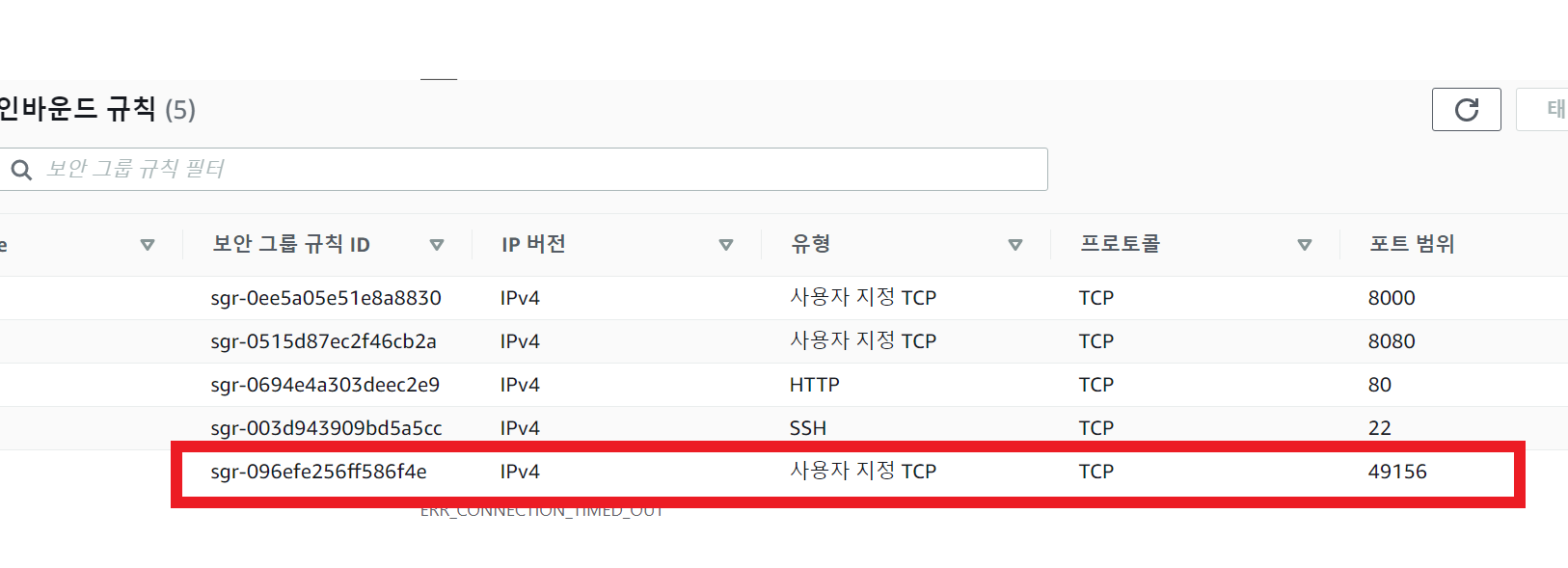 - aws 서버에서 해당 포트에 대하여 인바운드 규칙에 추가하지 않아 접속이 불가능