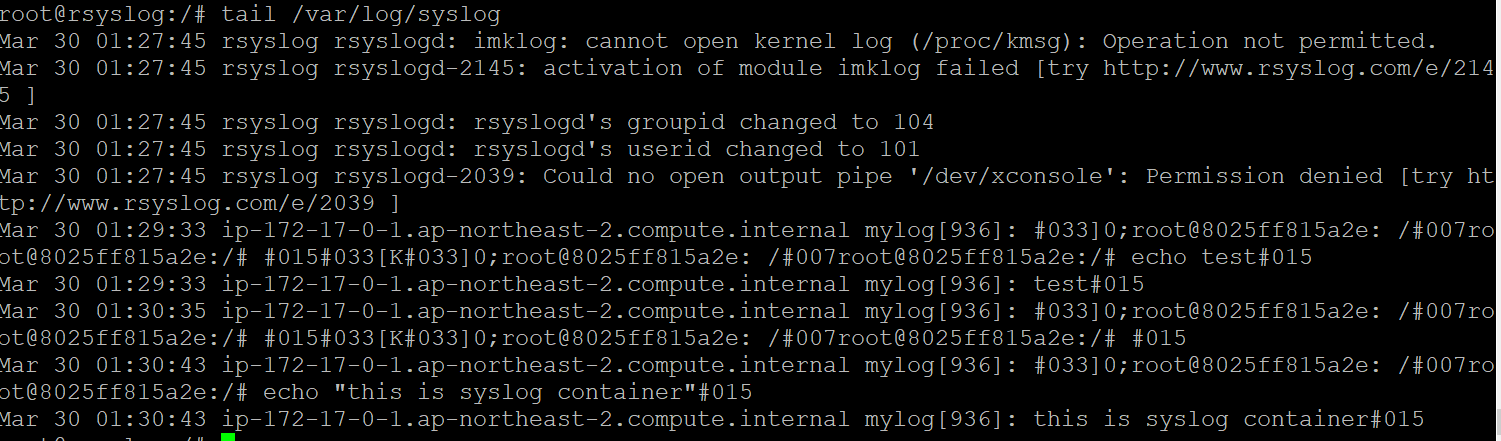 마지막에 this is syslog container 가 적힌 것을 확인할 수 있습니다. 뿐만 아니라 로그 앞에 mylog라는 명칭이 적혀있는 것을 확인할 수 있습니다.