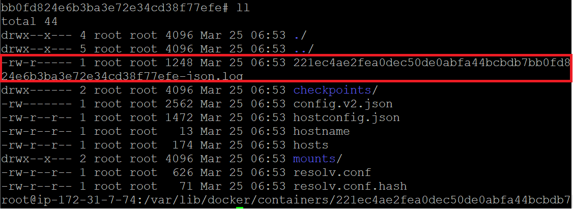 도커 컨테이너 로그는 /var/lib/docker/containers/${CONTAINER_ID}/${CONTAINER_ID}-json.logs에서 확인 할 수 있습니다.