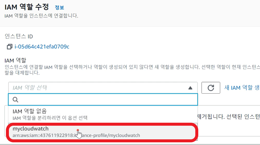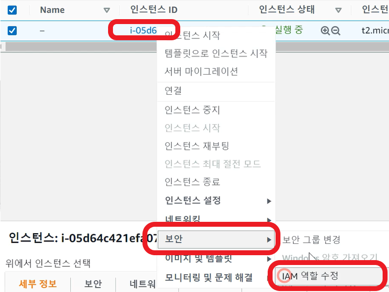 기존의 인스턴스를 우클릭하여 IAM 역할 수정