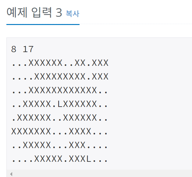입력의 첫째 줄에는 R과 C가 주어진다. 단, 1 ≤ R, C ≤ 1500. 다음 R개의 줄에는 각각 길이 C의 문자열이 하나씩 주어진다. '.'은 물 공간, 'X'는 빙판 공간, 'L'은 백조가 있는 공간으로 나타낸다.