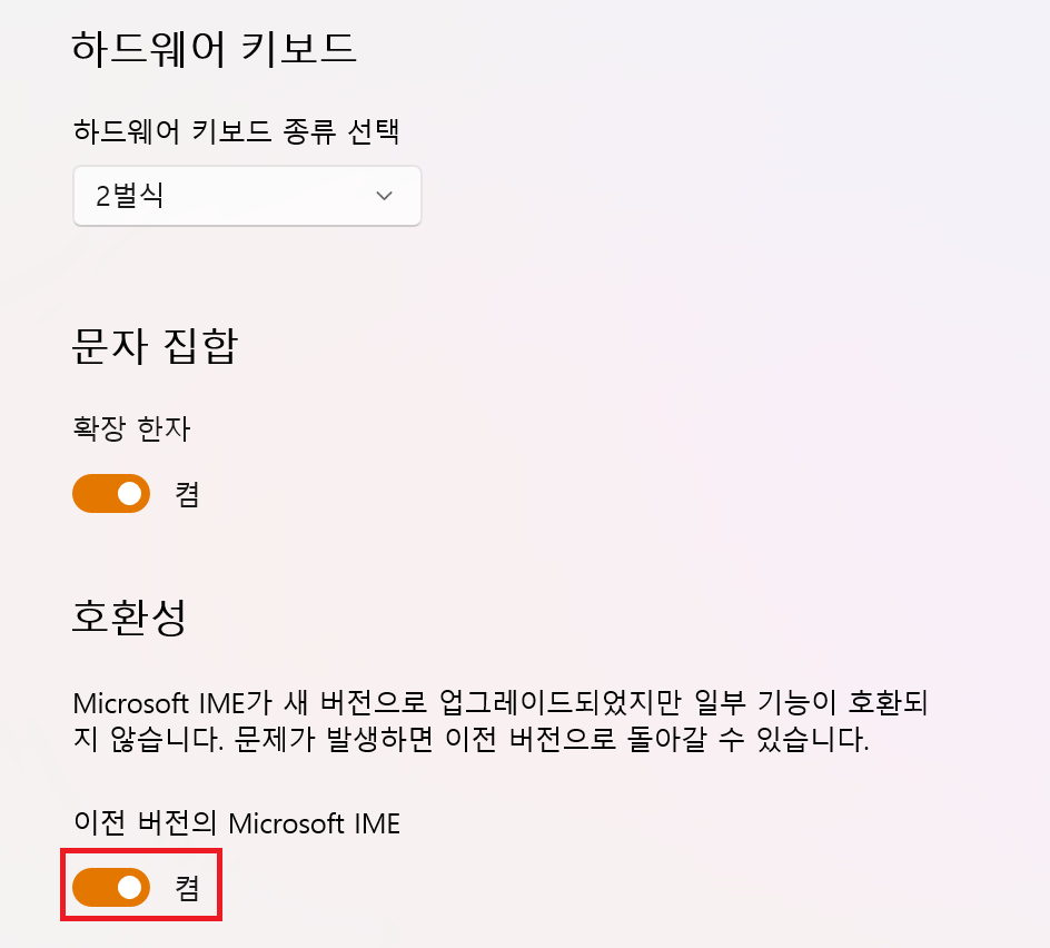 이전 버전의 Microsoft IME을 켬으로 변경